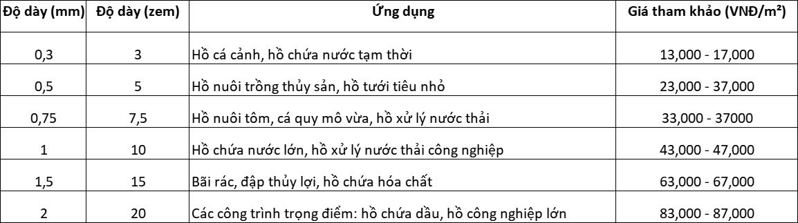 Bạt nhựa lót hồ HDPE có nhiều độ dày khác nhau để đáp ứng nhu cầu cụ thể của từng công trình. Độ dày của bạt thường được tính bằng zem (1 zem = 0.1 mm). Dưới đây là bảng liệt kê các độ dày phổ biến và ứng dụng tương ứng: